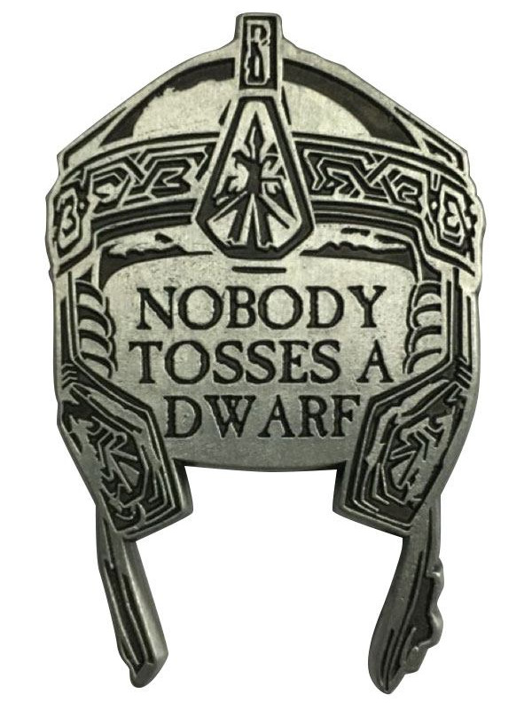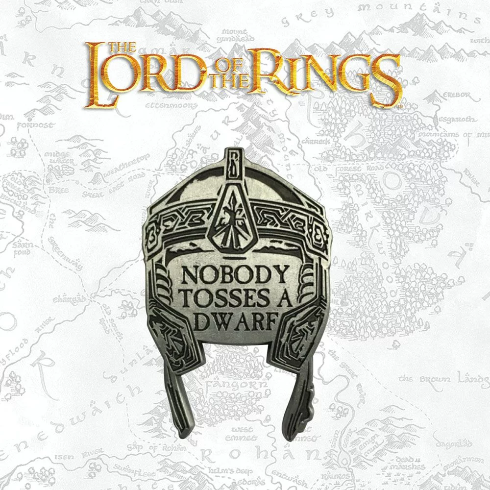 Der Sammler-Pin mit dem humorvollen Spruch „Nobody Tosses a Dwarf“ aus Der Herr der Ringe, gestaltet in Form von Gimlis Helm, wurde von Fanattik veröffentlicht. Der Pin ist weltweit auf 9.995 Stück limitiert, beidseitig geprägt und jedes Exemplar ist individuell nummeriert. Verpackt in einer sammlerfreundlichen Blisterverpackung.Durchmesser: wird ergänzt