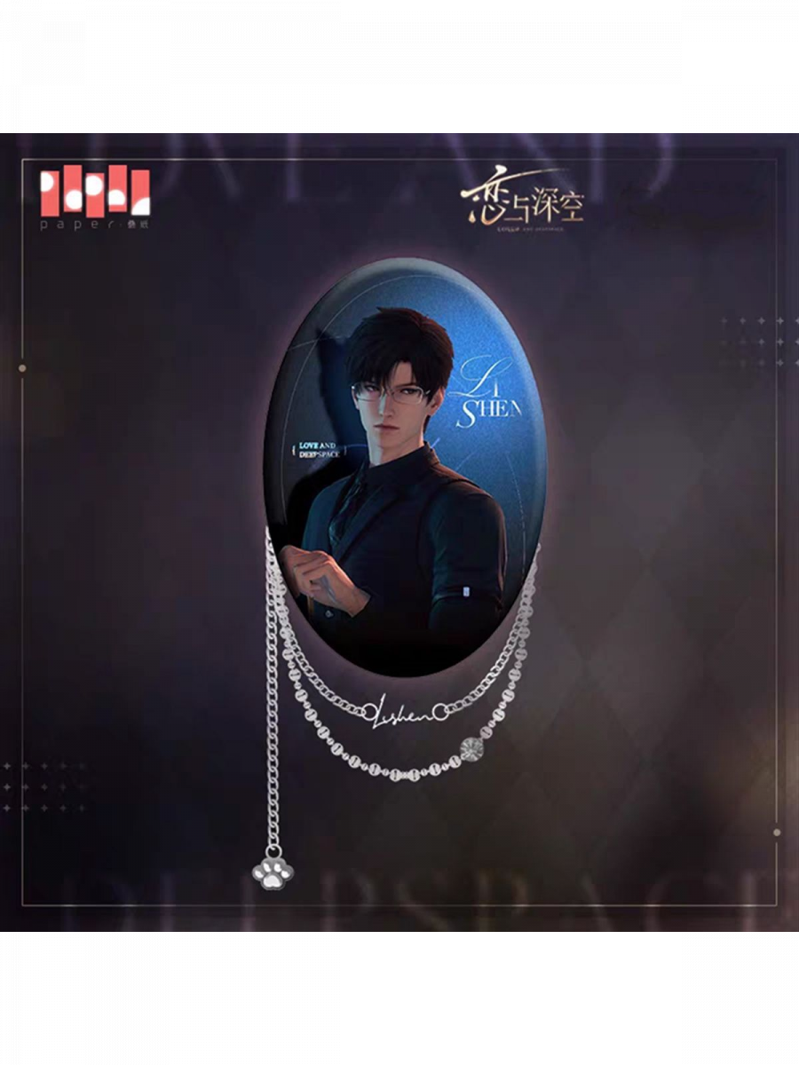 Eleganter Anstecker mit dem Motiv von Zayne aus Love and Deepspace im dunklen Design, versehen mit der Signatur der Figur und einer dekorativen Kette, die in einem Pfotenanhänger endet.