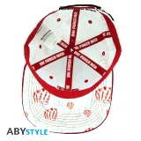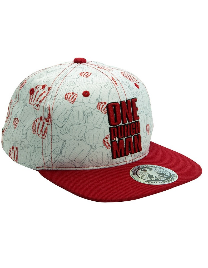 Coole Snapback-Kappe mit Motiv der japanischen Superhelden-Manga-, Anime- und Videospiel-Saga One-Punch Man. Auf der Kappe befindet sich ein Muster mit einer geballten Faust, ergänzt durch einen aufgestickten Schriftzug auf der Vorderseite der Kappe.