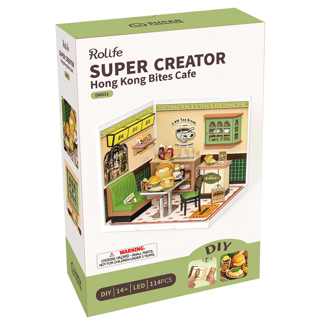 Eine detailreich gestaltete DIY-Miniatur eines Hauses, inspiriert von der ikonischen Teekultur Hongkongs, die lokale Spezialitäten, ein stilvolles Interieur und ein modulares, stapelbares Design aus der Serie Rolife Super Creator einfängt.Größe: 163 x 176 x 152 mm