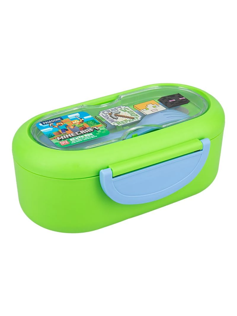 Diese praktische Brotbox mit Motiven beliebter Charaktere aus der Welt von Minecraft ist ideal für Snacks, Sandwiches und kleine Leckereien. Im Inneren findet ihr ein Fach zur Trennung der Lebensmittel sowie ein Besteck-Set – Gabel und Löffel – verstaut unter dem transparenten Deckel mit den ikonischen Figuren.