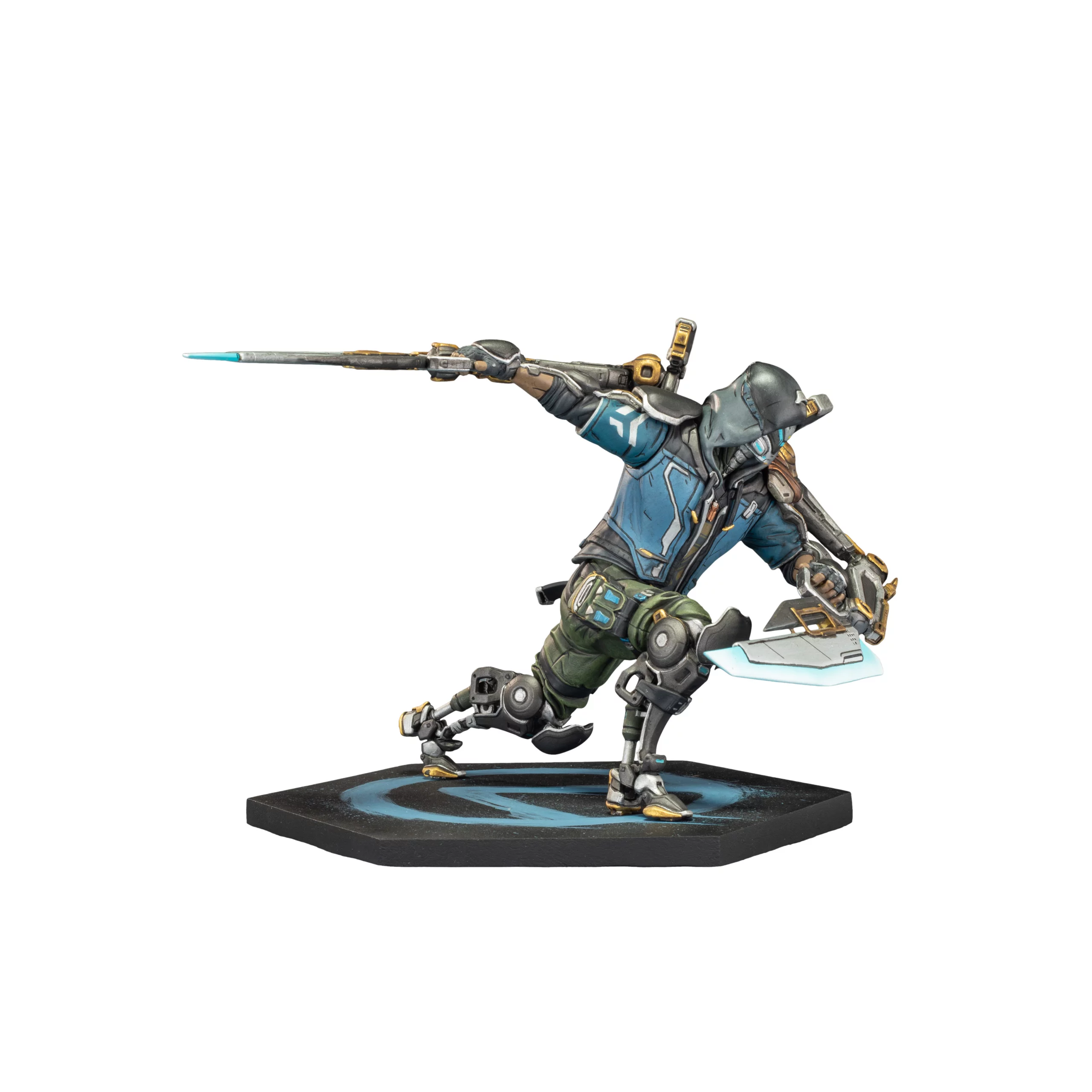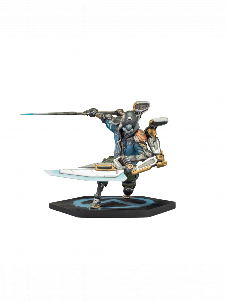 Seine elegante Rüstung, futuristischen Klingen und die dynamische Pose fangen den Stil eines Jägers perfekt ein, der sein Ziel niemals verfehlt.