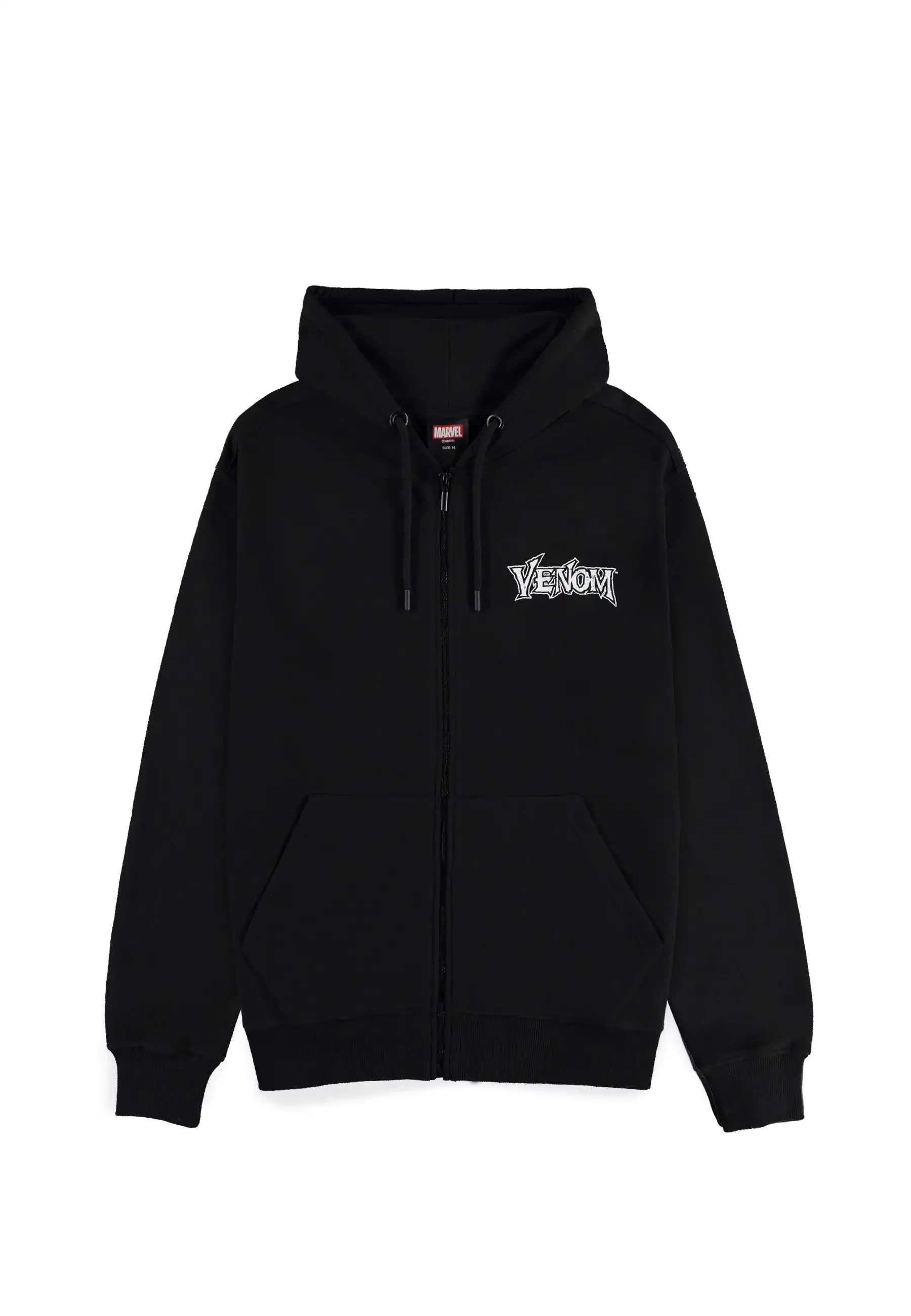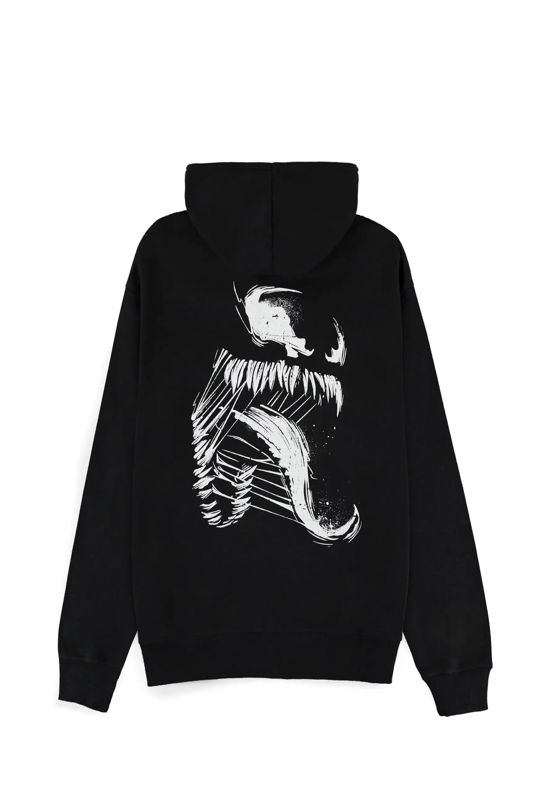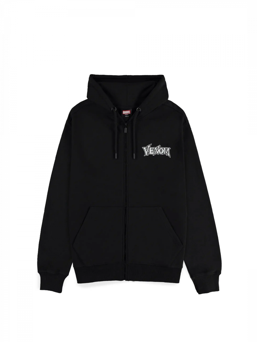 Das Marvel – Venom Hoodie in Schwarz mit Kapuze und Reißverschluss überzeugt mit einem dezenten Logo auf der Brust und dem ikonischen Print des aufgerissenen Symbionten-Mauls auf dem Rücken.