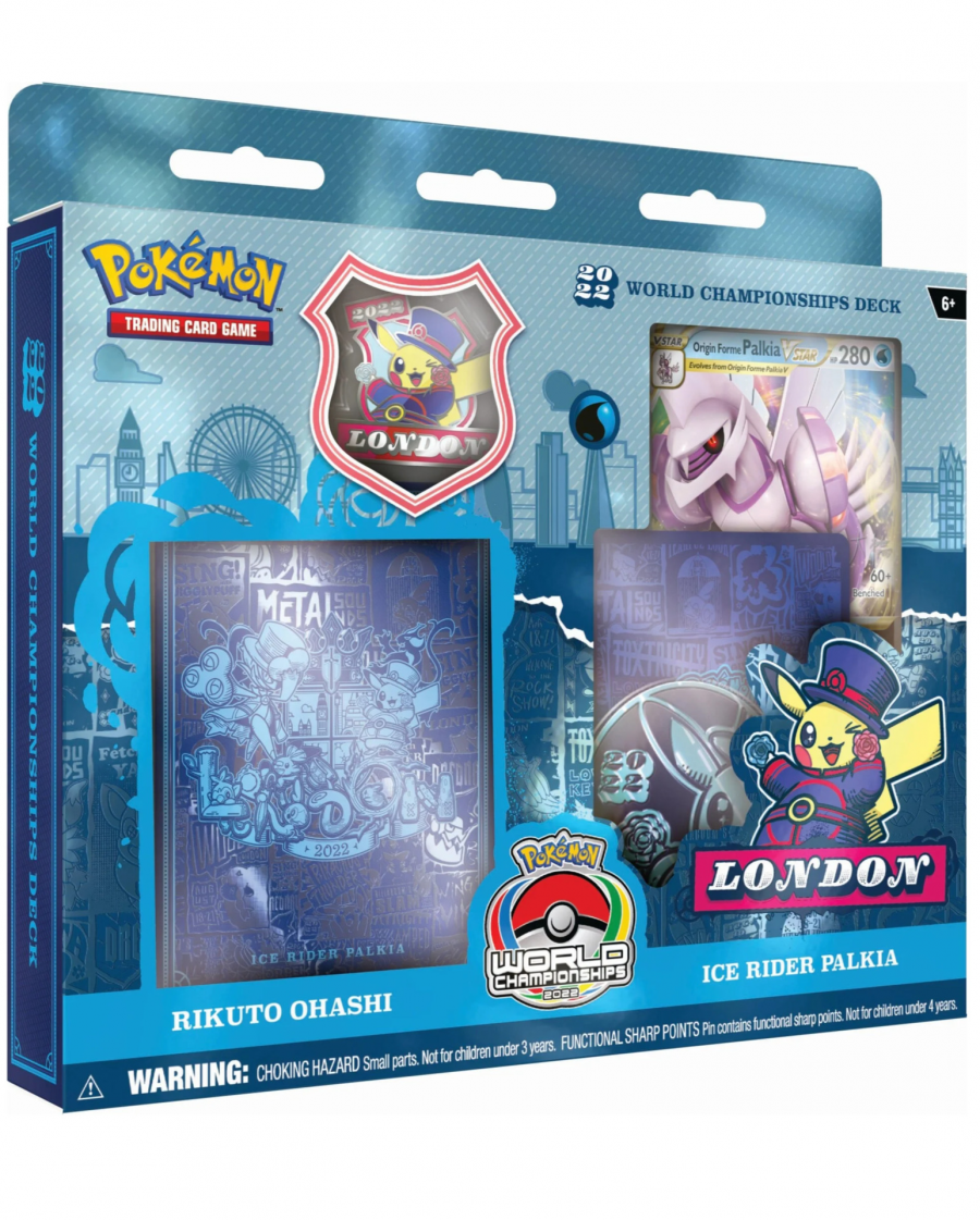 Spezielles Championship-Paket (Ice Rider Palkia), mit dem Rikuto Ohashi bei den TCG 2022 Weltmeisterschaften in London gespielt hat. Neben den Karten selbst finden Sie in der Verpackung eine Kartenbox, ein Booklet, einen Pin, eine Münze, ein Spielmatte und ein Poster.