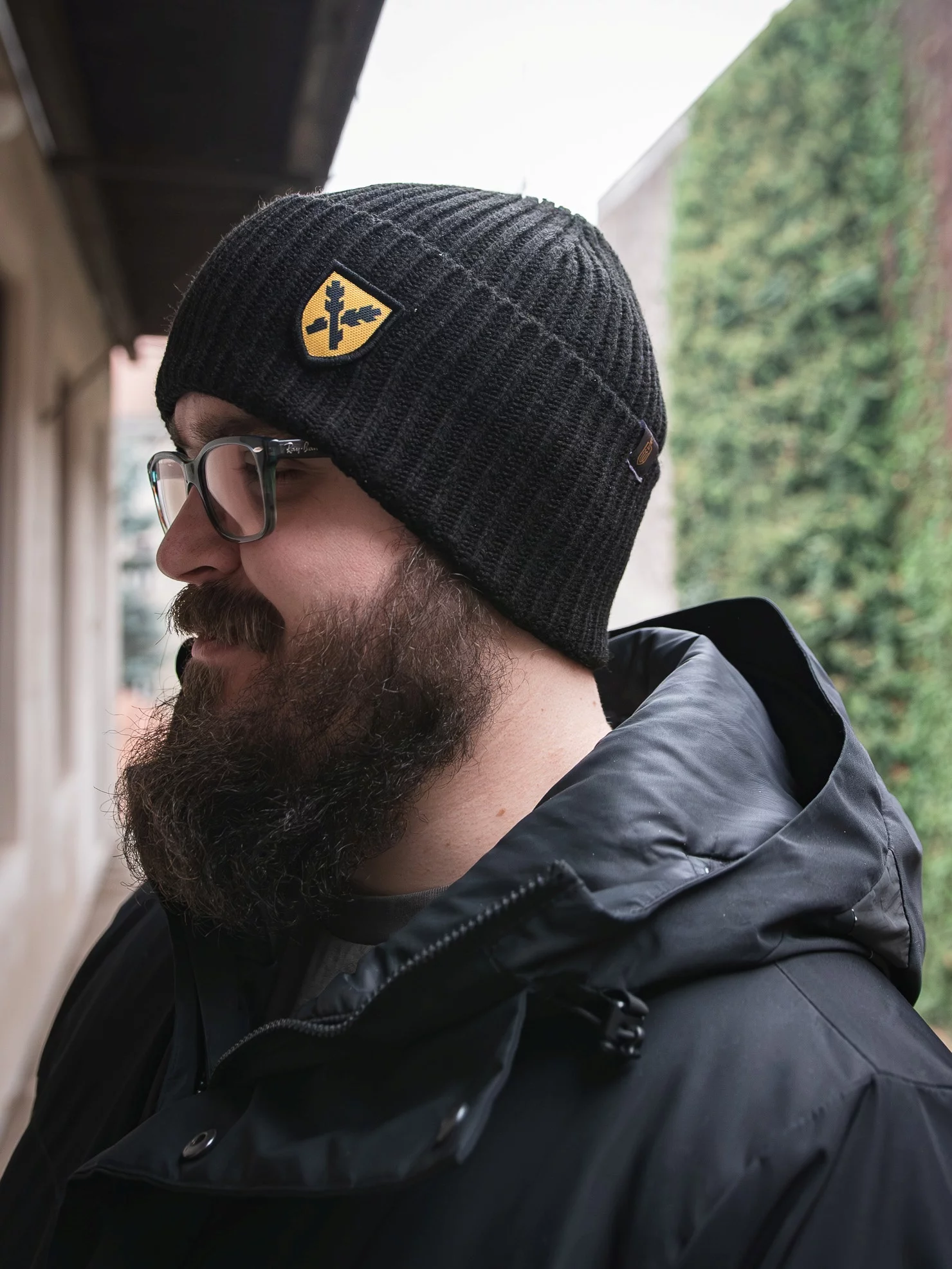 Wenn selbst den Edelleuten kalt wird, kommt die Mütze ins Spiel, die eines Adeligen würdig ist. Die elegante schwarze Mütze ist mit dem Wappen von Hans Capon von Pirkstein bestickt und trägt ein dezentes KCD-II-Label auf der Rückseite. Gefertigt aus innovativem Polylana – der nachhaltigen Alternative zu Wolle und Acryl, die Weichheit, Wärme und Langlebigkeit vereint. Das grobe Chunky-Rib-Strickmuster mit breitem Umschlag behält perfekt seine Form und hält euch bei jedem Ausritt aus Rattay ins Abenteuer warm.