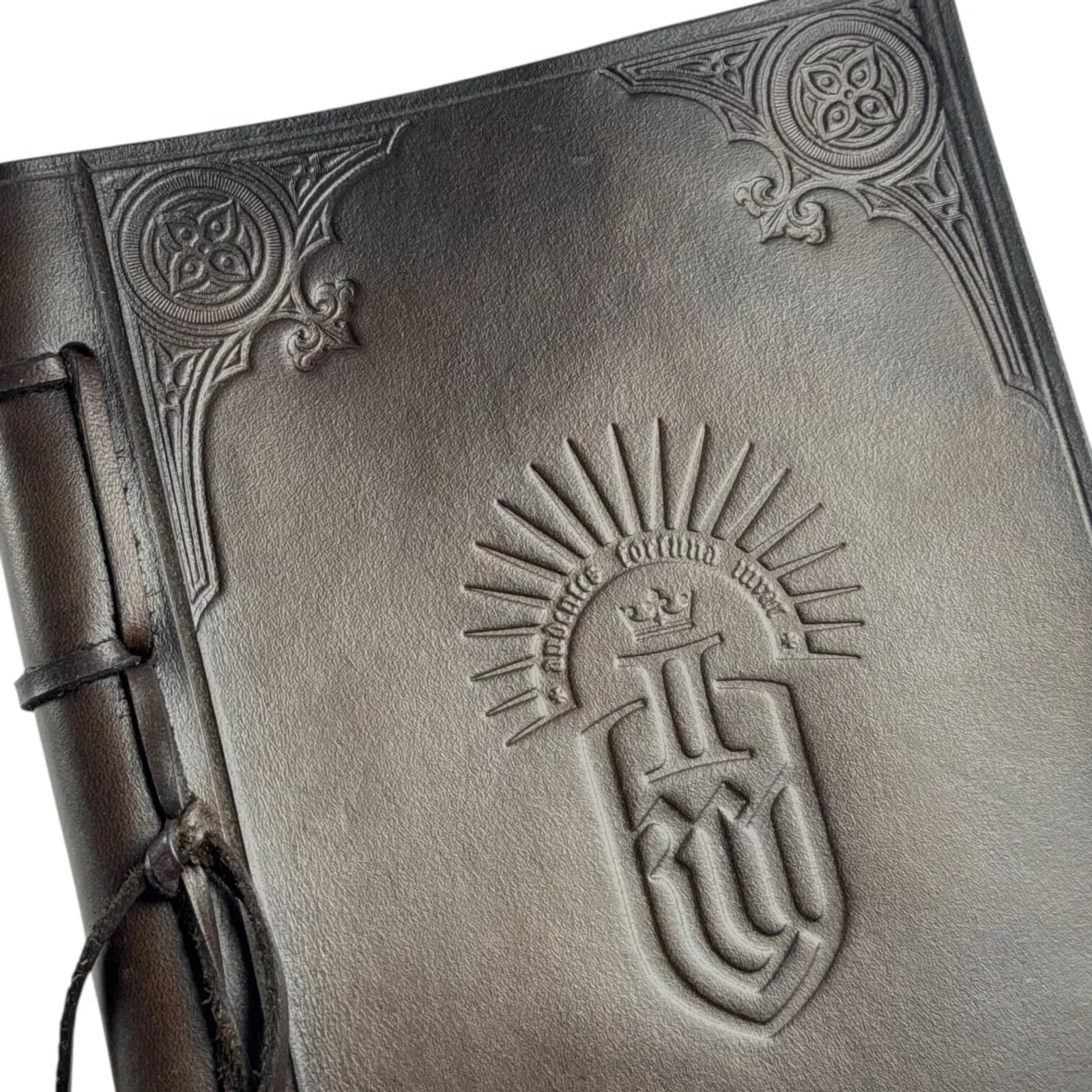 Notizbuch mit handgefertigtem, verziertem Ledereinband und geprägtem Logo des Spiels Kingdom Come: Deliverance II. Die Ecken des Ledereinbands sind mit Motiven geschmückt, die von geretteten alten Prägestempeln stammen – nach mehr als hundert Jahren finden sie nun wieder Verwendung und werden zu neuem Leben erweckt.