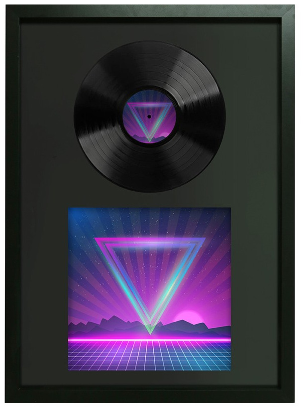 Abmessungen:50 × 70 cm (Rahmen), 29,5 × 29,5 cm (Passepartout für das Albumcover), 30,5 cm (Durchmesser der Vinylplatte) -