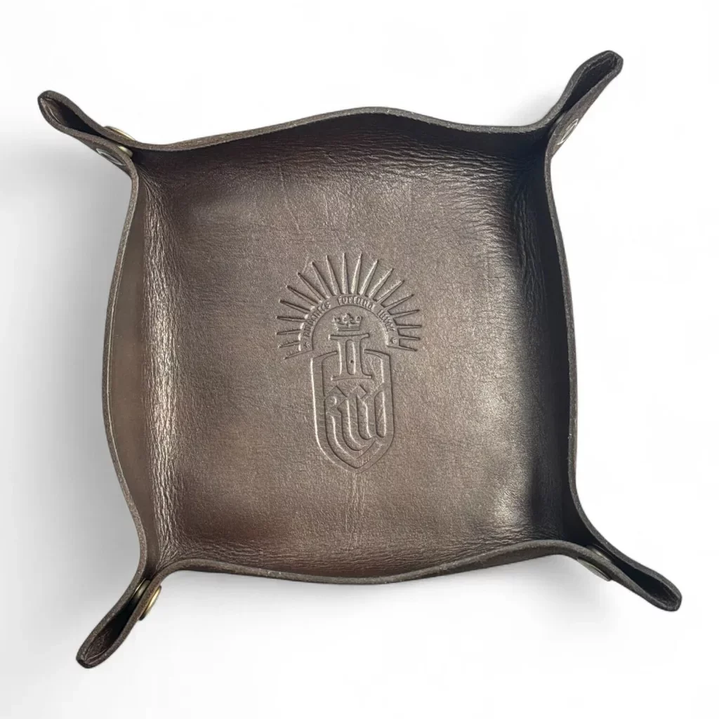 Lederwürfelbecher und Spielwürfel im Set mit einem Würfeltablett (Dice Tray), die jeden Abend mit Freunden am Lagerfeuer noch angenehmer machen.