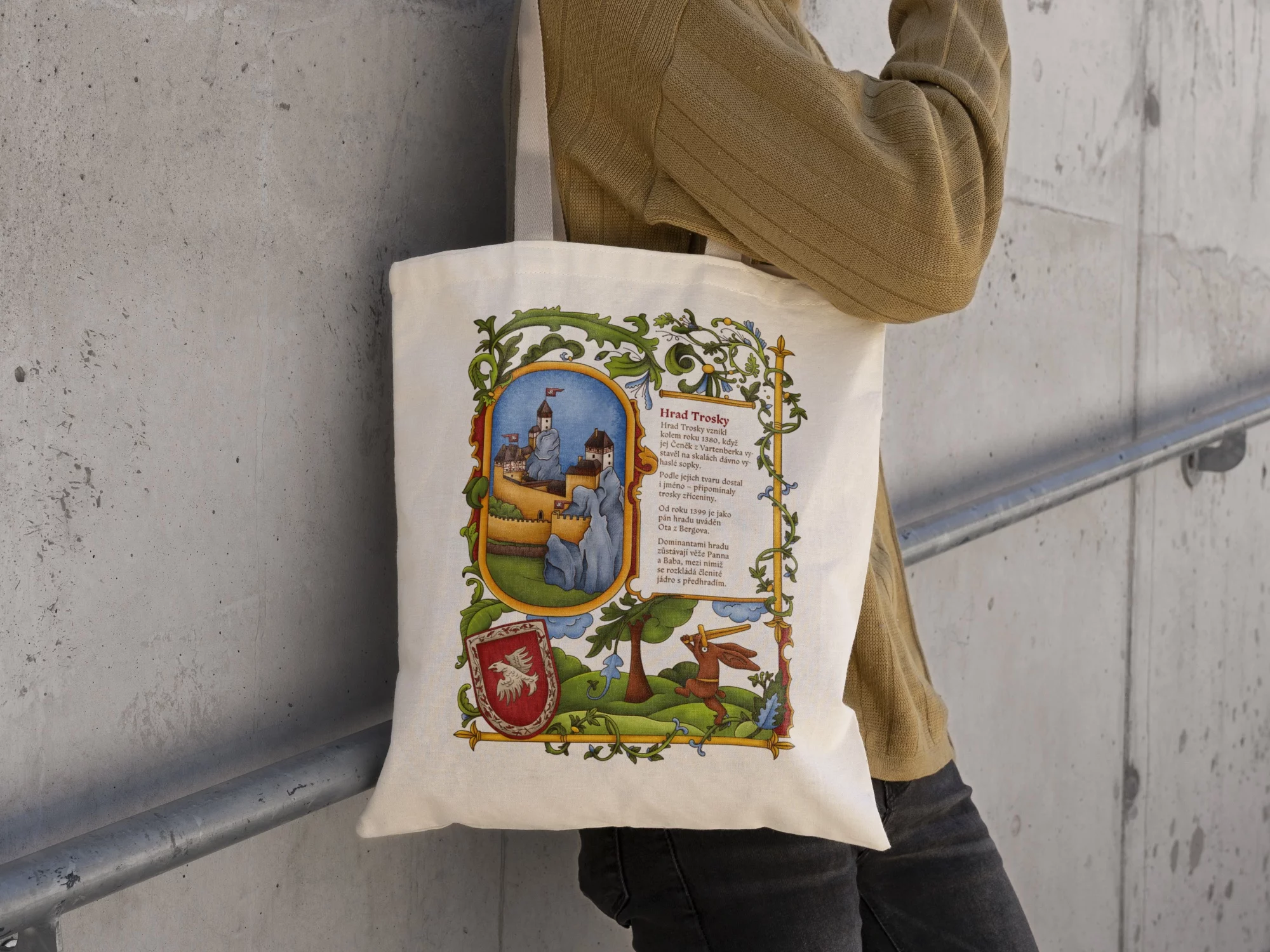 Die Stofftasche mit illuminiertem Motiv der Burg Trosky erinnert an mittelalterliche Handschriften und fängt die Schönheit sowie die Geschichte dieser ikonischen Ruine ein, die in der Welt von Kingdom Come: Deliverance II zum Leben erwacht.