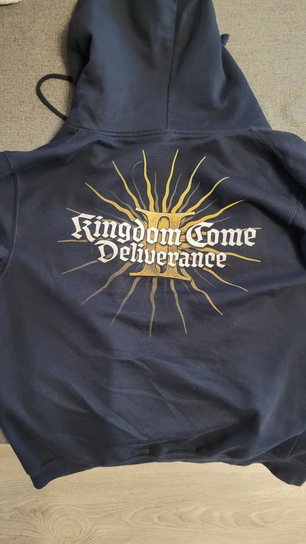 • Sweatshirt mit Reißverschluss und dem Motiv des tschechischen Mittelalter-Videospiels Kingdom Come: Deliverance II von Warhorse Studios. Auf der Vorderseite finden Sie ein stilvolles, zeitgenössisches Emblem des Spiels in Goldfarbe und auf der Rückseite ein großes Logo des Spiels.