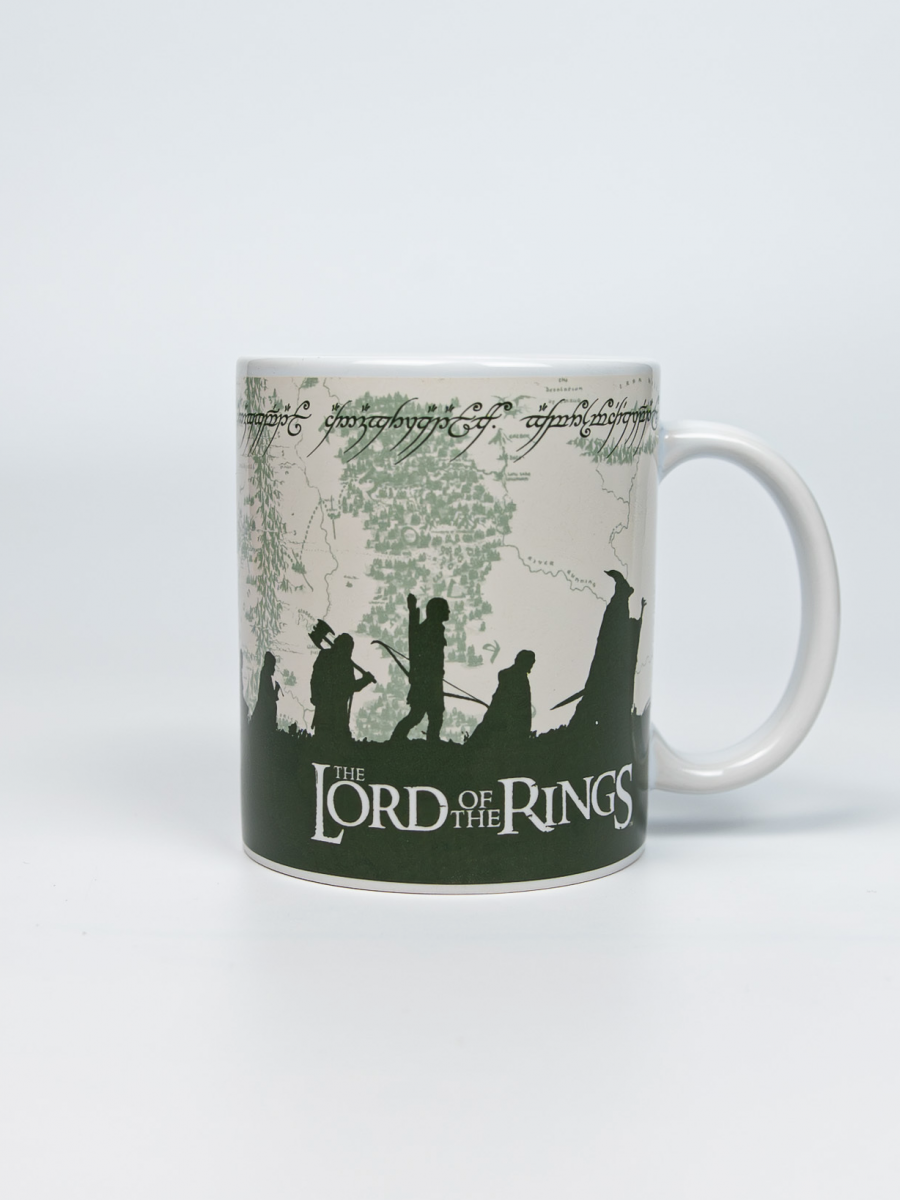 Begebt euch gleich mit dem ersten Schluck auf eine Reise durch Mittelerde. Diese coole Tasse zeigt die Silhouetten der Gefährten des Rings vor dem Hintergrund der legendären Karte - so erkennt jeder Fan von Der Herr der Ringe diese ikonische Expedition auf den ersten Blick.