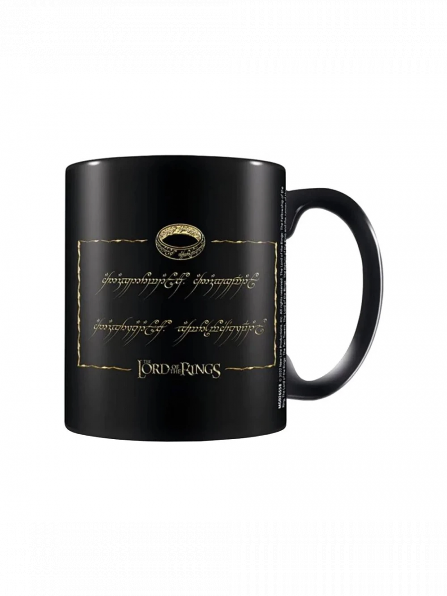 Das dunkle Design wird durch die ikonische Inschrift in Elbisch und das Motiv des Einen Rings ergänzt, wodurch die Tasse geheimnisvoll und zeitlos wirkt. Jeder Schluck erinnert an die Macht des legendären Artefakts.