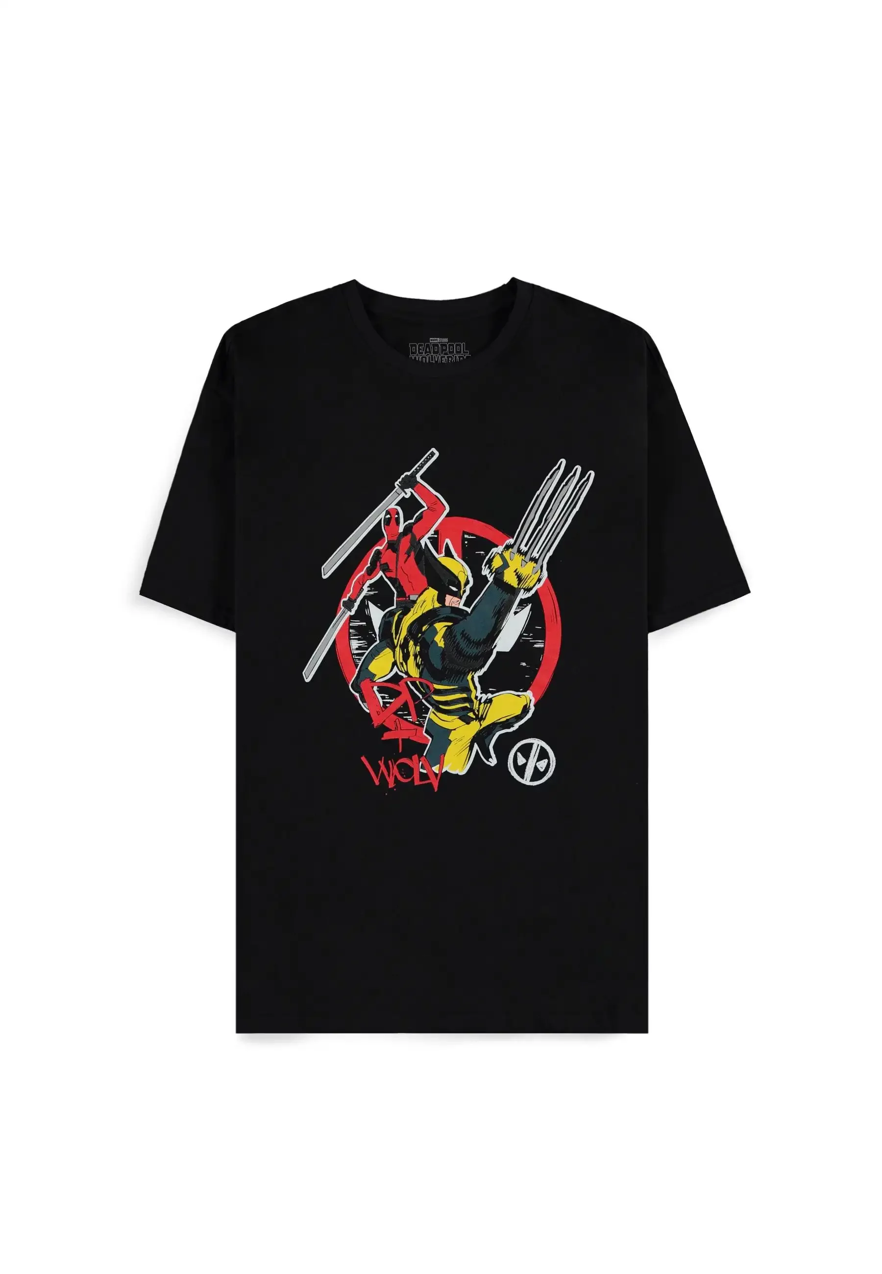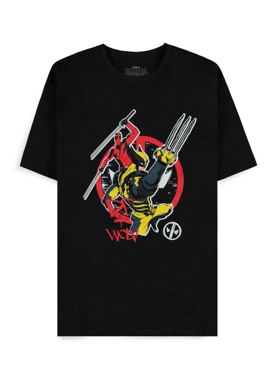 Schwarzes T-Shirt Deadpool - DP+Wolvie vereint zwei ikonische Marvel-Helden im Action-Design. Deadpool und Wolverine liefern sich auf der Vorderseite einen Kampf im typischen Comic-Stil, der auf den ersten Blick beeindruckt. Ideale Wahl für Fans von Humor, Chaos und scharfen Krallen.Material: 100% Baumwolle