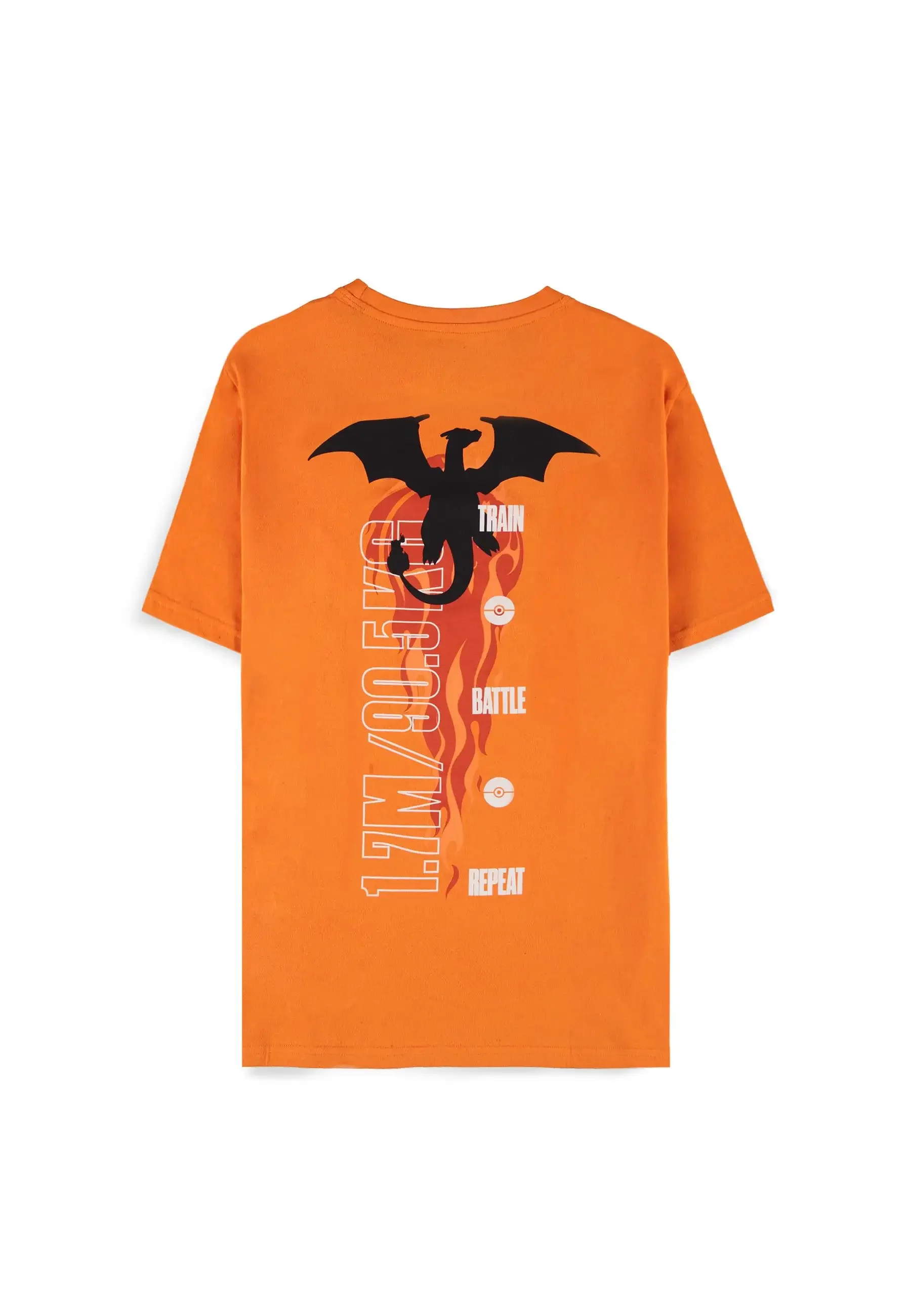 Orangefarbenes T-Shirt Pokémon - Glurak begeistert alle Trainer, die Feuer-Typen lieben. Auf der Brust befindet sich ein dezentes Pokéball mit der Nummer #006, während auf dem Rücken die Silhouette von Glurak in Flammen zusammen mit seiner Größe und seinem Gewicht erstrahlt. Cool, energisch und ideal für den Alltag wie auch für Kämpfe in der Welt von Pokémon.Material: 100% Baumwolle