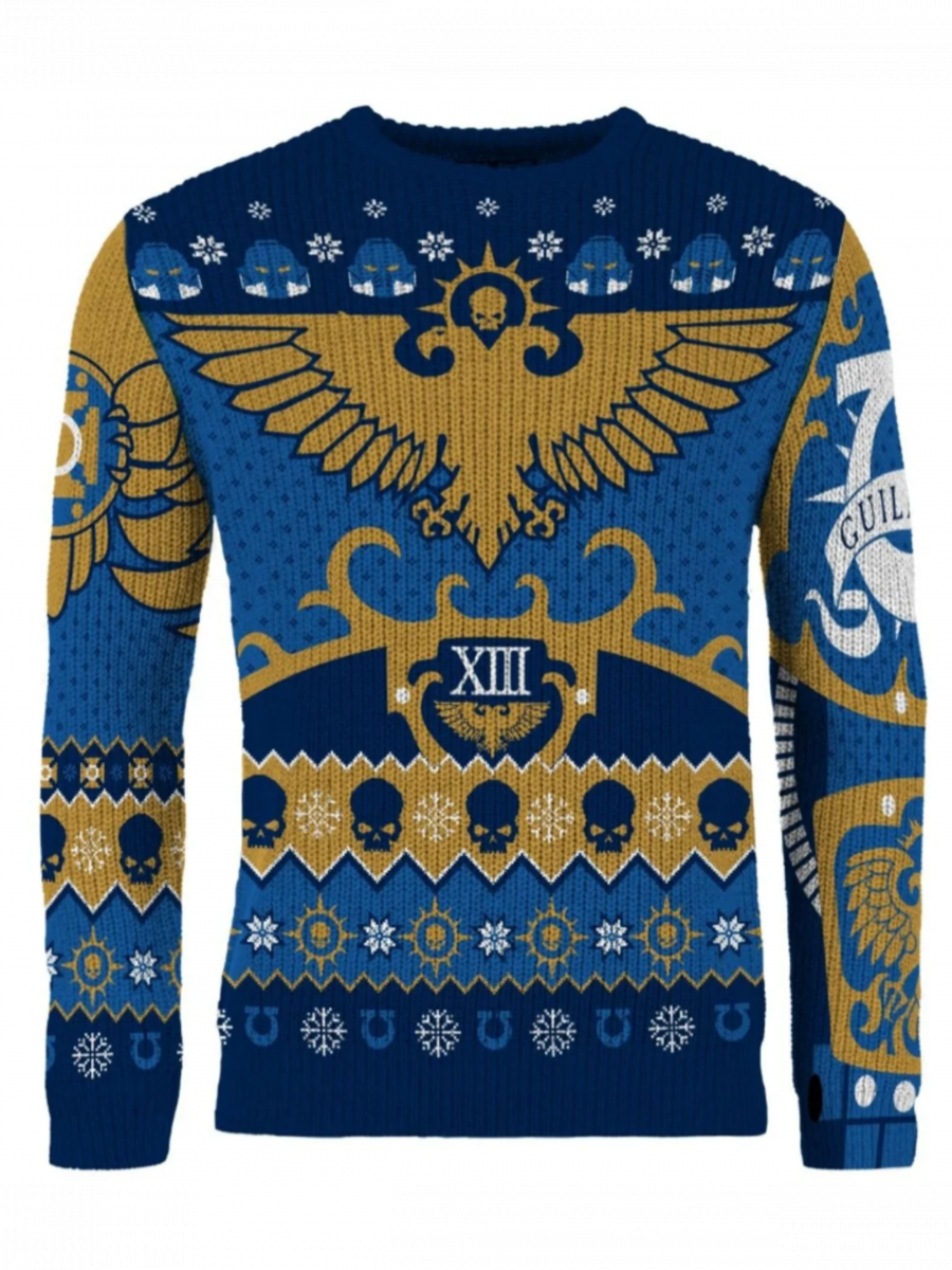 Feiert Weihnachten im imperialen Stil! Der blau-goldene Pullover mit ikonischer Warhammer 40.000-Grafik ist ideal für alle treuen Fans der Ultramarines und des Imperiums der Menschheit.
