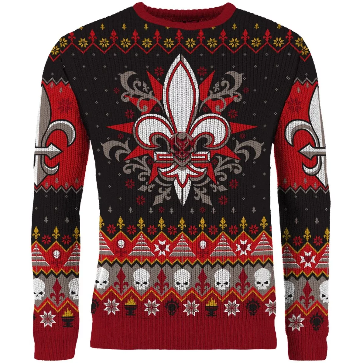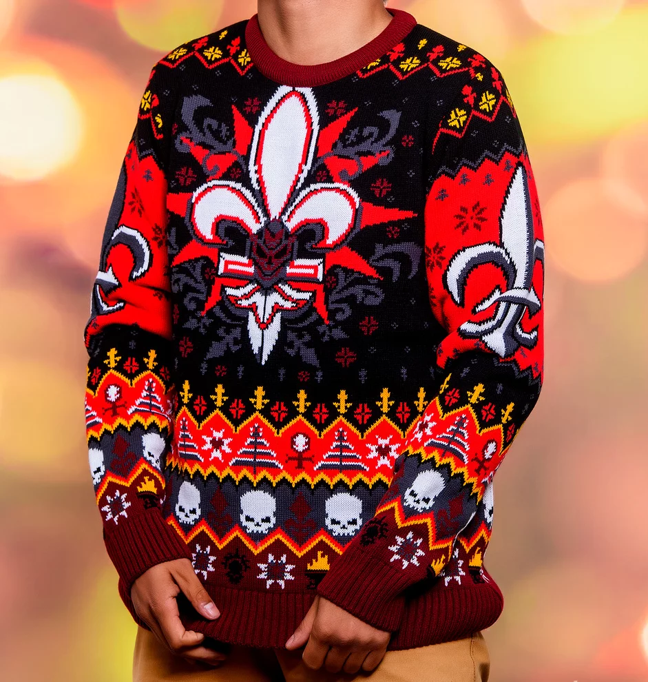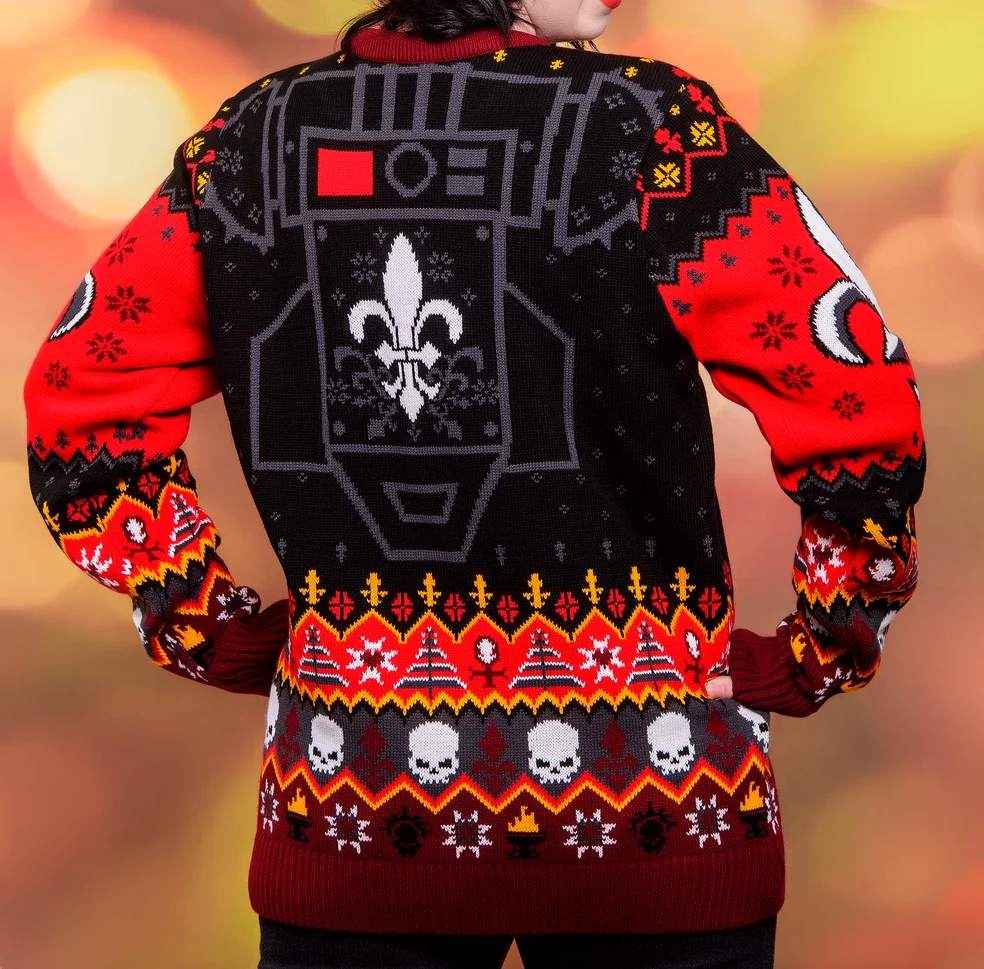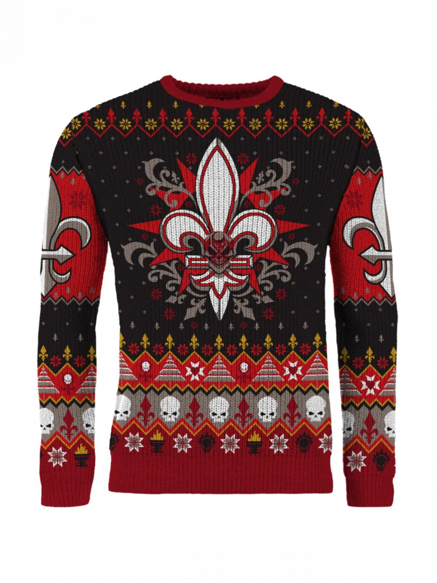 Ein Weihnachtspullover in den Farben und Symbolen der Sisters of Battle wird jeden Warhammer 40.000-Fan begeistern. Das auffällige Lilienmotiv, ergänzt durch Totenköpfe und festliche Muster, verbindet die düstere Grimdark-Atmosphäre mit weihnachtlicher Gemütlichkeit.