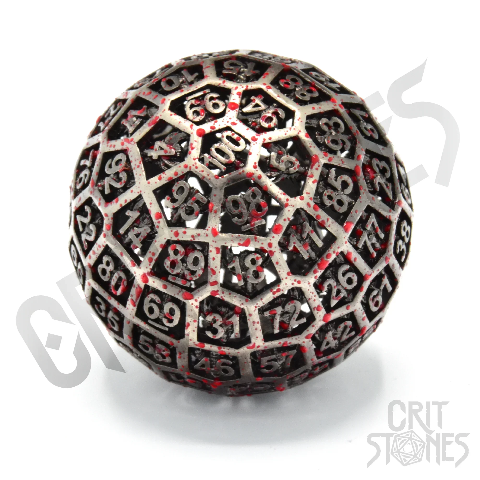Centigrave Hollow Metal ist ein hohler D100-Würfel aus Metall, dessen detaillierte Konstruktion und blutrote Akzente ihn zu einem echten Meisterwerk machen. Jede Zahl ist präzise graviert und sorgt für einen geschmeidigen, aber kraftvollen Wurf.