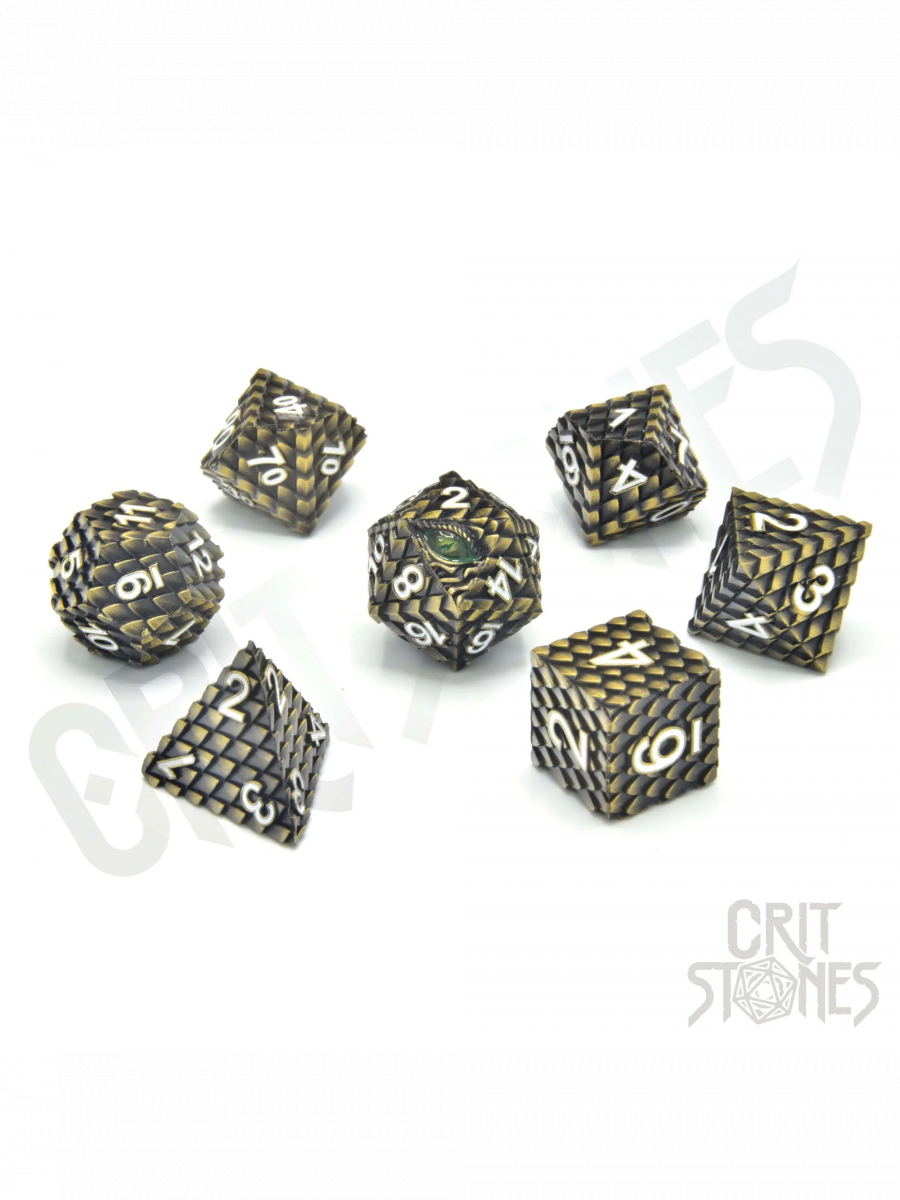 Drudaxizius Metal Set wirkt, als würde es von einem uralten Drachen bewacht. Metallwürfel mit Relief von Drachenschuppen und kraftvollen Augen verleihen jedem Wurf epische Dimension.