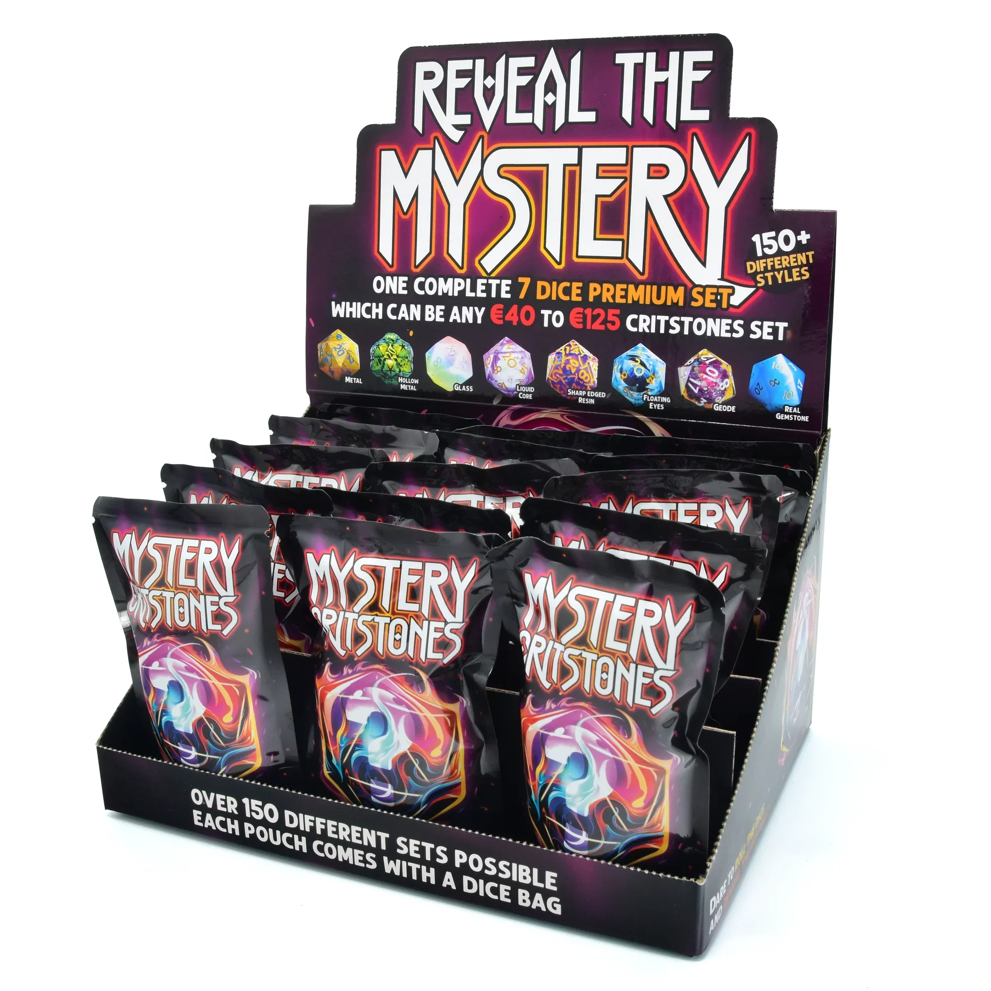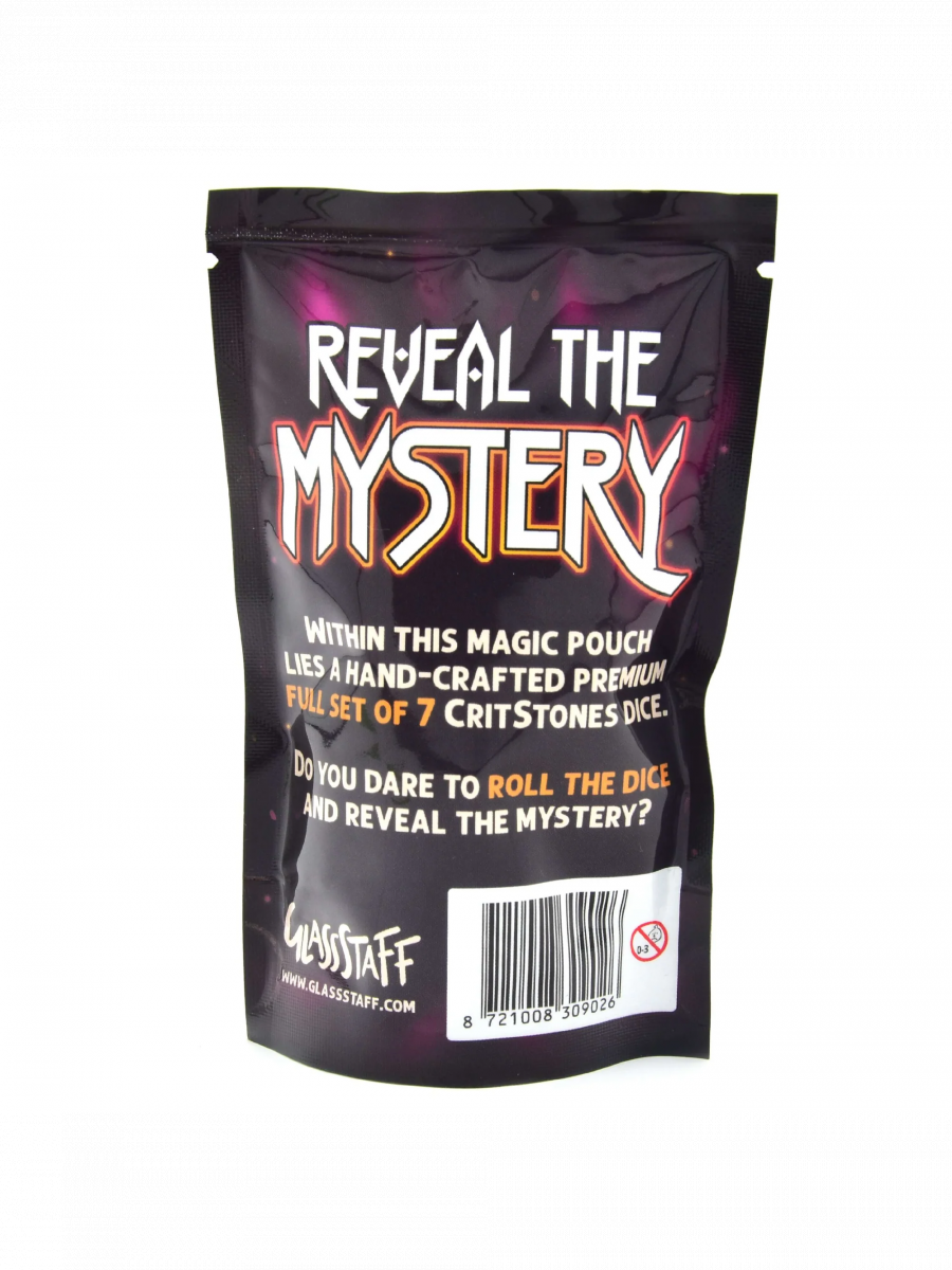 Mystery CritStones ist ein Set für alle, die Spannung, Überraschungen und den Moment lieben, wenn der entscheidende Wurf fällt. Jedes Pack verbirgt ein komplettes Premium-Set von 7 Würfeln – entdecke metallische, gläserne, flüssige, hohle und kristalline Schätze.