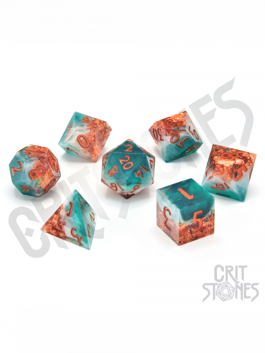 Mystic Marine Sharp Edge Resin Set kombiniert türkisfarbene Meerestöne mit kupferfarbenen Reflexen, die an den Sonnenuntergang auf der Wasseroberfläche erinnern. Scharf geschnittene Kanten garantieren präzise Würfe und ein luxuriöses Aussehen, das jeden Spieltisch beeindruckt.