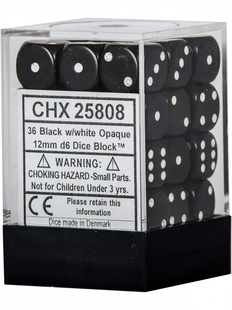 Das Chessex-Set Opaque – Black (36 Stück) in elegantem Schwarz mit weißen Augen ist ideal für Tabletop- und Brettspiele.