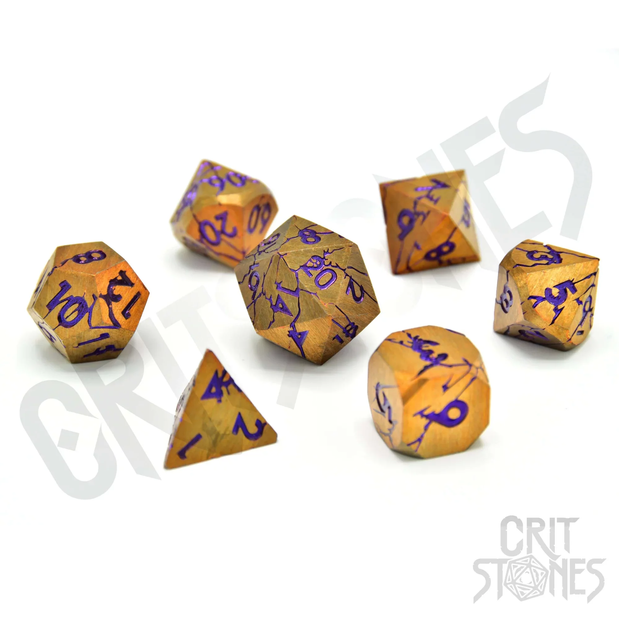 Shattered Sigils Metal Set glänzt mit einer goldfarbenen Oberfläche, violetter Schrift und mystischen Symbolen, die wie verlorene Runen alter Zauberer wirken. Jeder Würfel erscheint wie ein Artefakt mit eigener Macht.